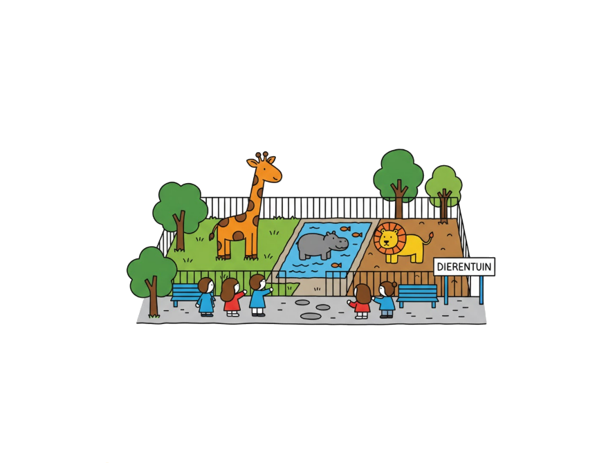 In dit levendige project verkennen kinderen de dierentuin als miniwereld vol orde en verrassende chaos. Via denkvragen, categoriseeropdrachten, zelfontworpen dierentuinboekjes en gesprekken met de denkvriendjes ontdekken ze hoe je dieren kunt ordenen en wat er gebeurt als je dat niet doet. Ze maken een vragen-drieluik, bouwen een dierenrijkposter, analyseren diergroepen en ontwerpen een toekomst-dierentuin of zelfs een ‘mensentuin’. Met spel, strips, toneel en debat leren ze kritisch en creatief denken over leefomgevingen, verschillen, overeenkomsten en maatschappelijke keuzes. De dierentuin wordt zo een rijk thema vol structuur, verwondering en fantasie.